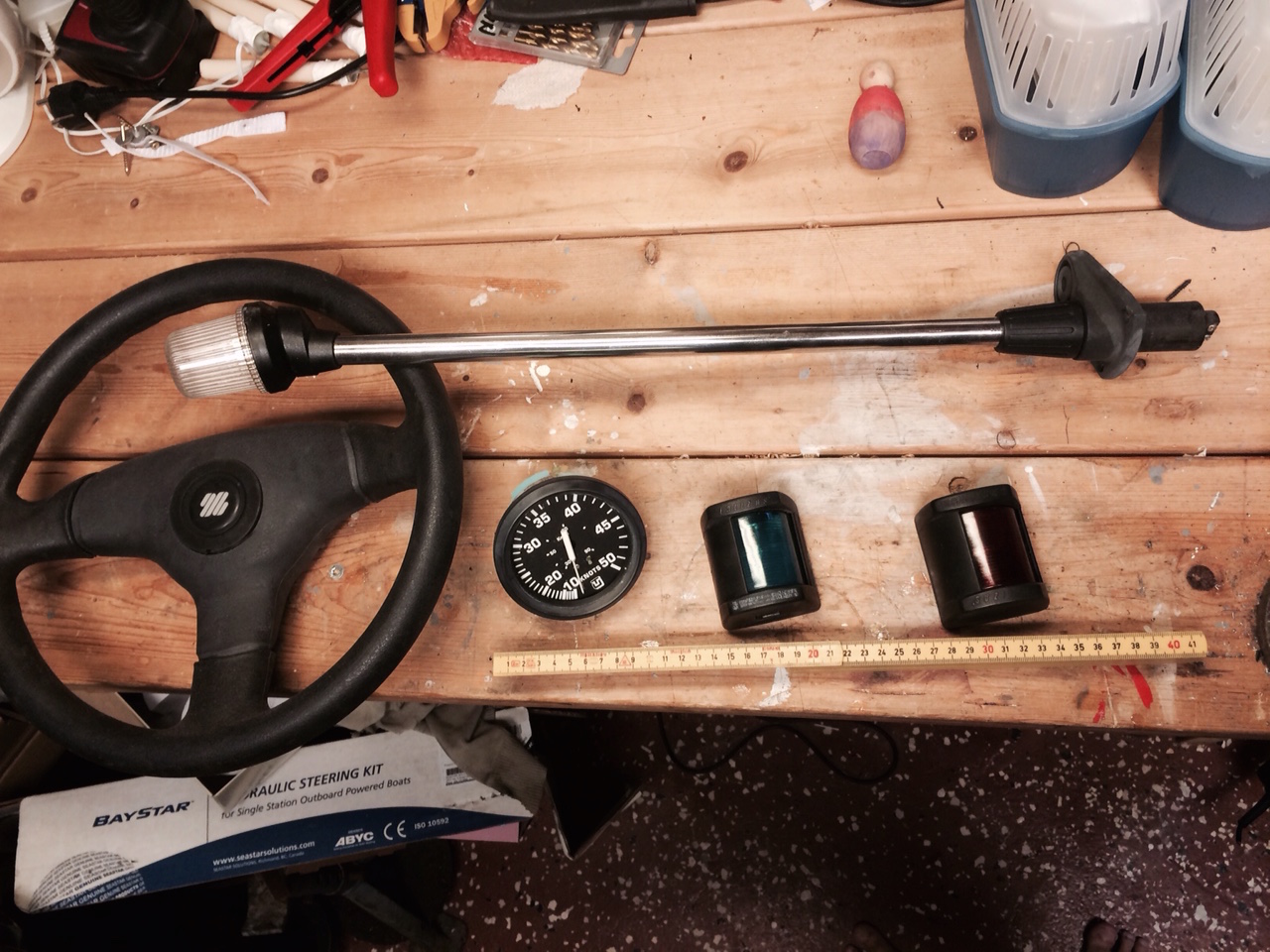 Efter att ha bytt till LED lanternor och hydraulstyrning, blev följande över. Det bortskänkes till valfri sportfiskare som eventuellt vill lysa upp tillvaron. Alla delar har varit monterade original på en HR 510. Topplanternan saknar ”locket” (används om man tar bort ”stången” och vill stänga igen infästningen), men detta påverkar inte funktionen. Tryckloggen har jag ingen aning om hur den är tänkt att fungera eller om den fungerar. :-)