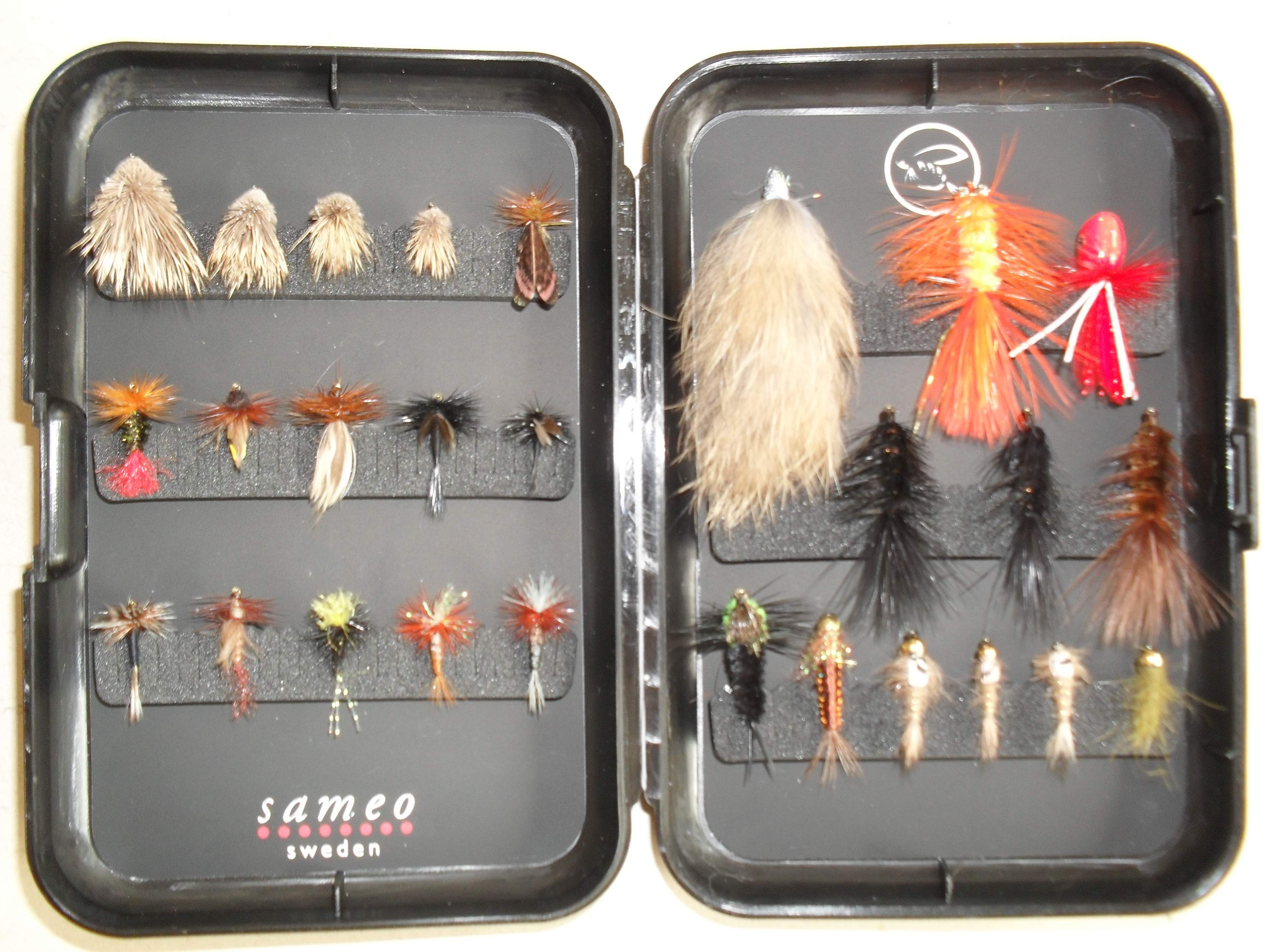 Alla flugorna fungerar för Regnbåge och Öringen. Till Rödingen är det nog endast torr flugorna och nymferna längst ner på höger sida.