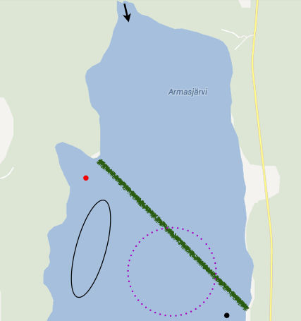 Jag börjar med den norra delen av sjön. Längst i norr är det ett inlopp från en liten bäck, dock väldigt liten. Norr om det gröna sträcket är det ca 2m djupt med undantag närmast stranden. Innanför den lila cirkeln någonstans ligger det ett grund där vi brukade fara och fiska när jag var liten, dock vet jag inte exakt var det är. I den svarta ovalen är det djupare än vid övriga platser i norra sjön, ca 4-11m. Den röda pricken visar en plats där vi har fått några enligt oss större gäddor (ca 3kg) samt min kompis farsa som har fått 2st på ca 7kg strax utanför den viken. Den svarta pricken har inget med gäddor att göra med där hade jag en enorm abborre (ingen tror mig utom min kompis som var med) troligtvis 3-4kg då den var större än våra rekordgäddor, abborren tappades såklart då håven var intrasslad i fiskeväskor och spön. Inte nog med att jag tappade den just vid båtkanten så skulle den simma ner i vattnet så där äckligt retfullt sakta så det bara kändes som att jag ville hoppa efter.