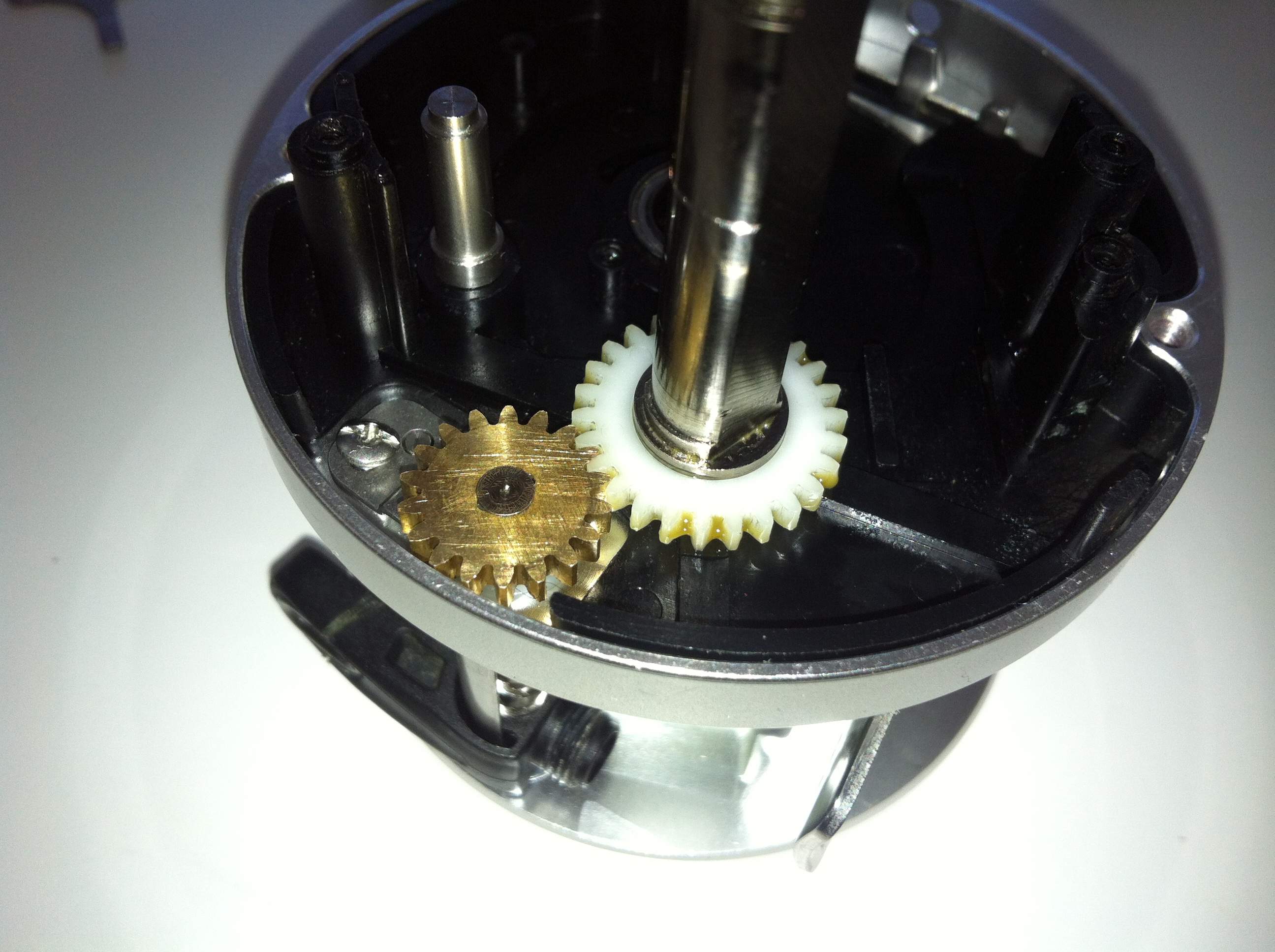 -Plocka bort huvuddrevet. Det kan sitta lite men vrid en smal spårmäjsel under drevet så får du loss det. Var försiktig så att du inte förstör fästet i plastkåpan som huvudaxeln sitter i.