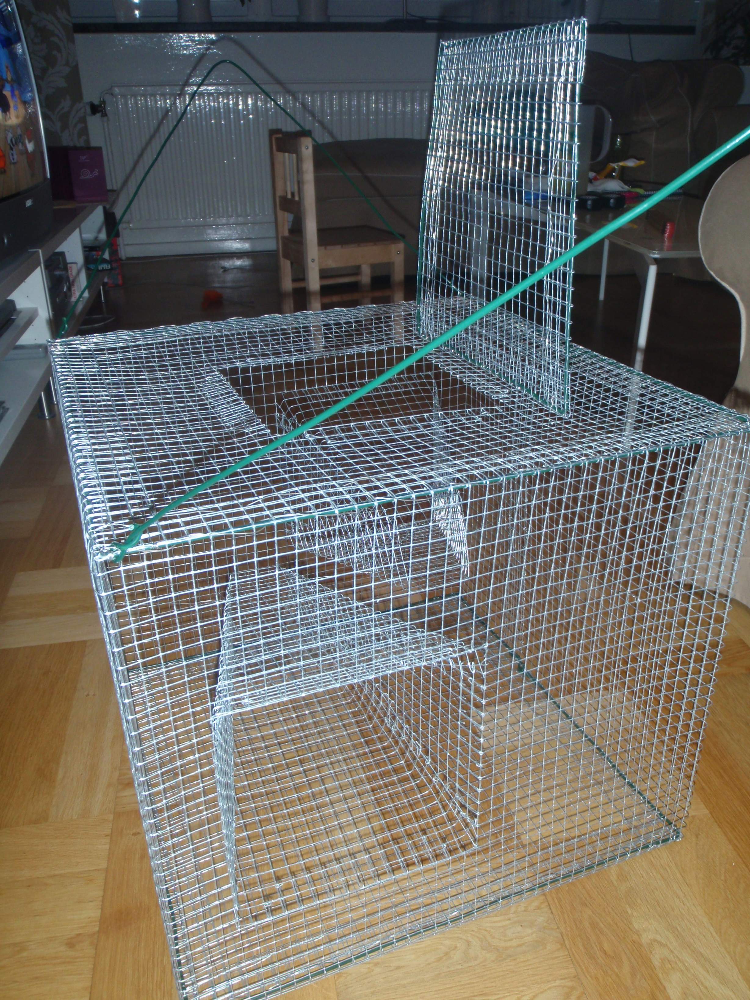Byggde en lucka som man kan öppna istället för att vika upp nätet. Ingångarna är 20 cm stora och smalnar sedan av till ca 7 cm. Ena ingången sitter 10 cm från botten och den andra 15 cm från botten. Vet inte riktigt vad som är bäst, utan byggde bara lite på känn.