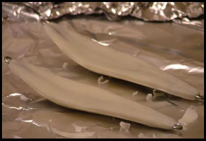 Efter att förtyngningen är på plats lägger du i ståltråden och fyller därefter igen med cernit. Cerniten krymper nästan ingenting i ugnen så baka draget så stort som du vill ha det då det är klart. Ett tips är att använda plastfolie mellan formen och draget så att det inte fastnar i formen. I början är det lätt hänt att man knådar degen så att den blir för mjuk med resultatet att draget tappar formen något då man tar upp det ur formen. Detta avhjälps genom att låta draget svalna en stund liggandes i formen. Stoppa in det i kylen om du har bråttom.