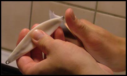 Tryck ut ett tunt lager cernit i formen. Vill du förtynga draget så gör det nu. Oförtyngt fiskar det så grunt att man nästan kan fiska med det på land. Med förtyngning kommer det ner lite i vattnet och kastar längre. Jag har provat att förtynga upp till ca 10g och det har fungerat bra. Bäst tycker jag att det fungerar då man förtynger jämnt i dragets längdriktning. Centreras förtyngningen för mycket på längden blir draget mindre tolerant mot olika inspinningshastigheter och/eller blir allmänt fladdrigt. Jag har dock inte märkt någon större skillnad om man förtynger i hela dragets bredd eller bara ger det en ”ryggrad”.