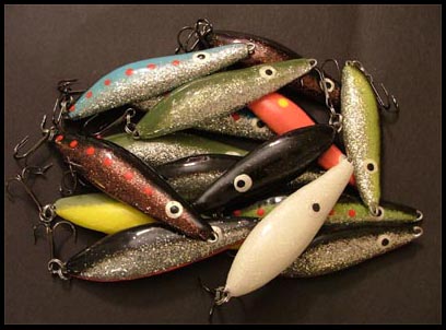 Ögon gör du enklast med hjälp av baksidan av ett borr eller penna som du doppar i lite färg. Annars finns ju ögon av reflextejp att köpa i många fiskebutiker.