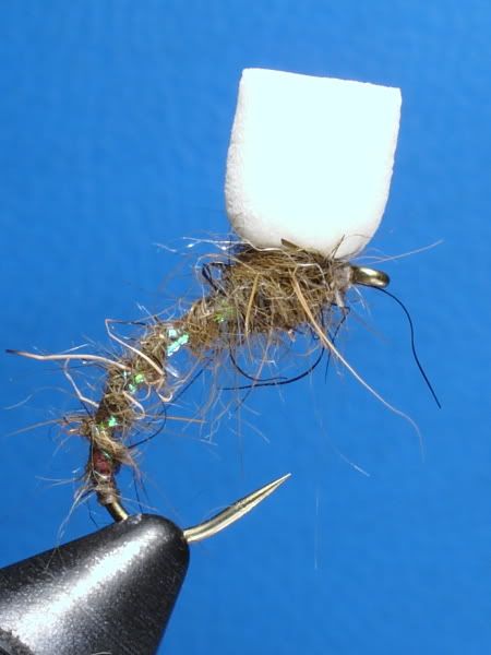 Denna bindes in med spetsen först mellan krok öglan och bröstet. Den här foam biten ska ju också tjäna som indikator för dig som fiskar. Så en väl synlig färg är ju bäst.