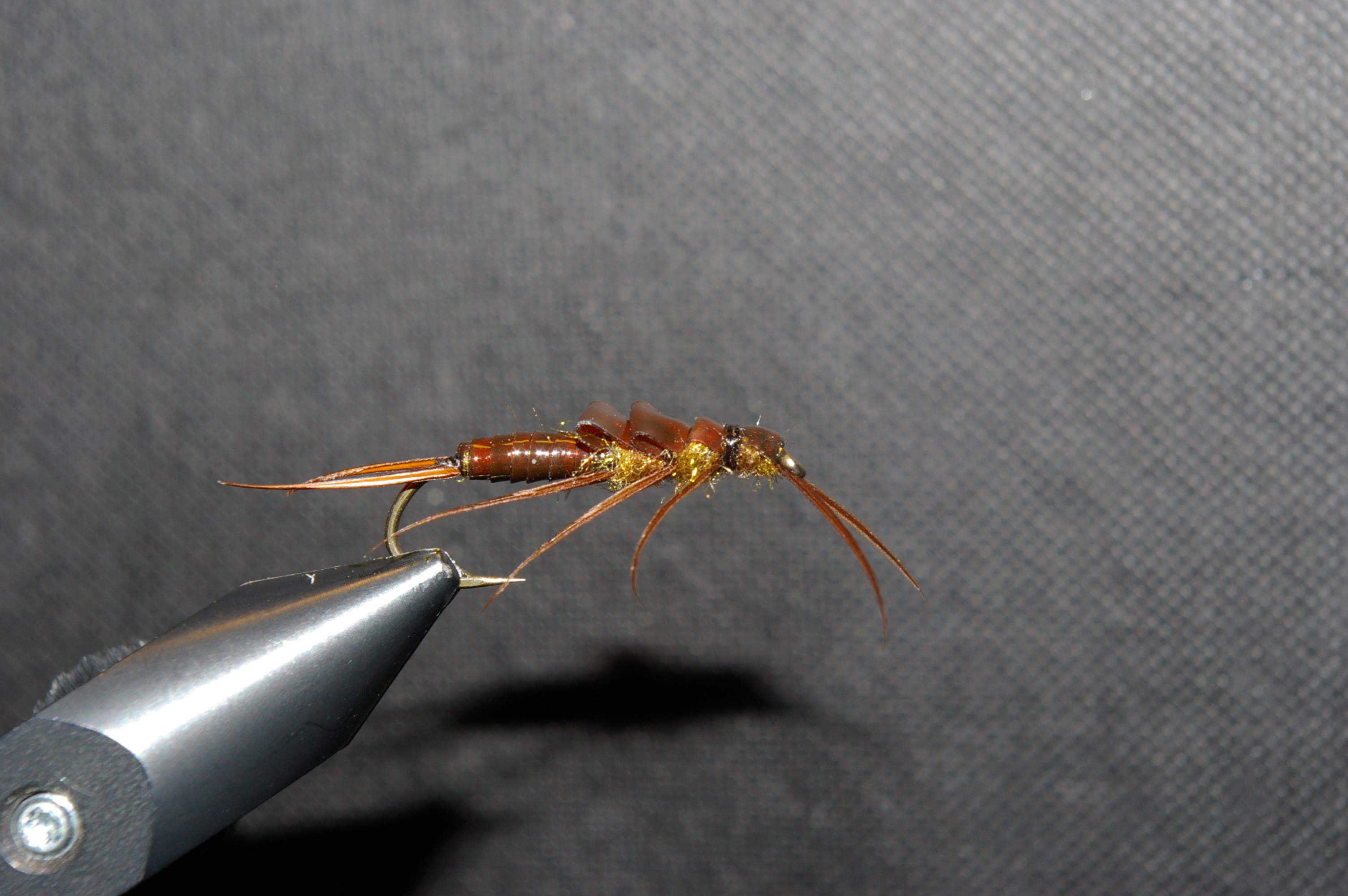 Dagsländenymfer i barkbrunt, bundna efter recept i nån bok. 20 st i #8... en hel påse flyrite åt fanders