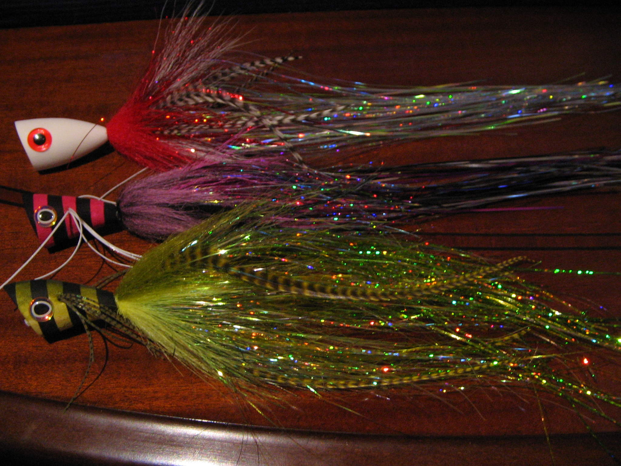 Bucktail, glitter, dubbingloop med mer glitter, fjädrar, craft fur, och sen bara på med popperskallen.
