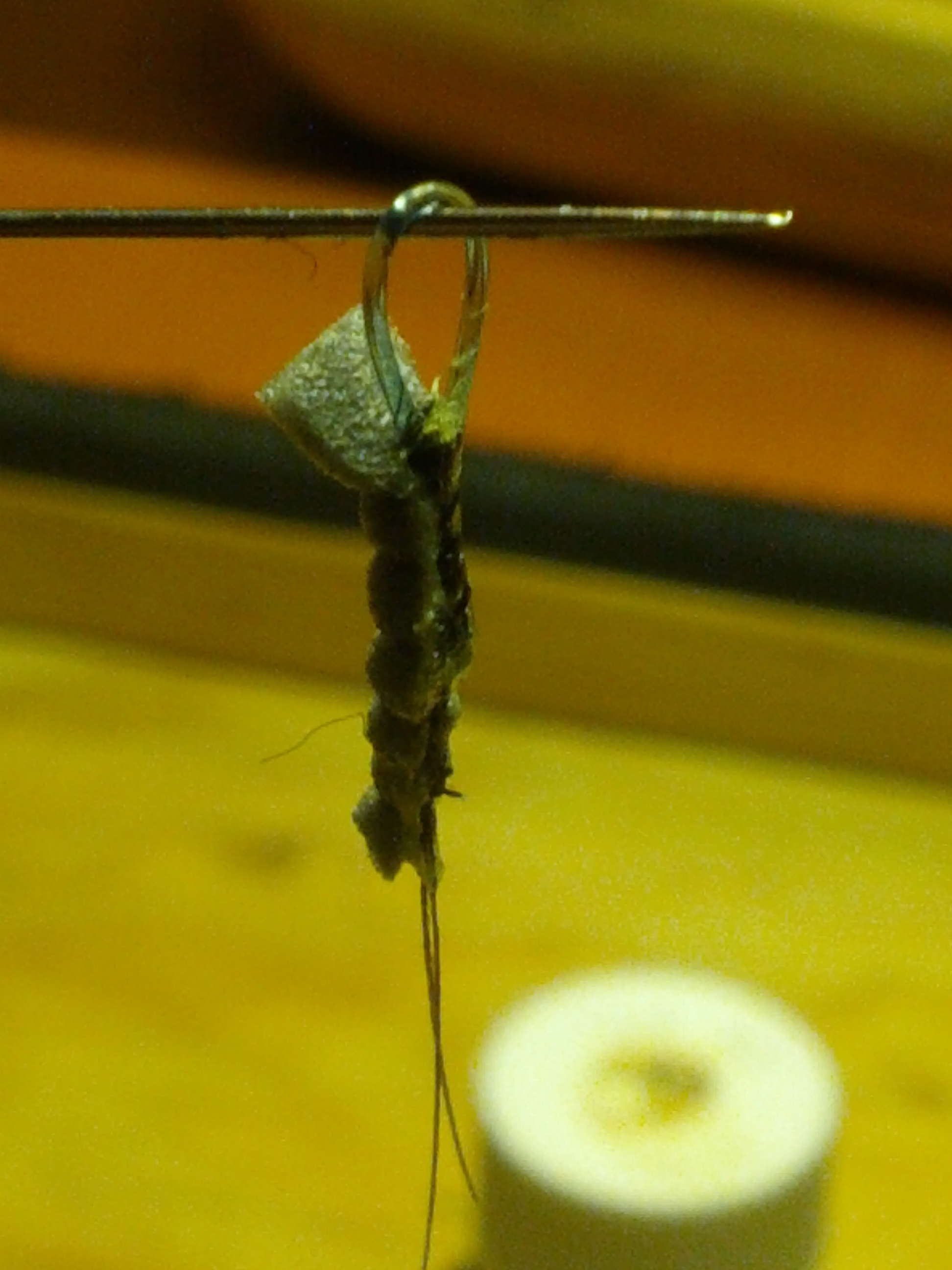 När du binder fast foamen på nålen spara tråden som blir över och bind in denna i i foam kroppen. Då kan du bestämma böjen på kroppen genom att dra i bindtråden innan man fixerar den på kroken