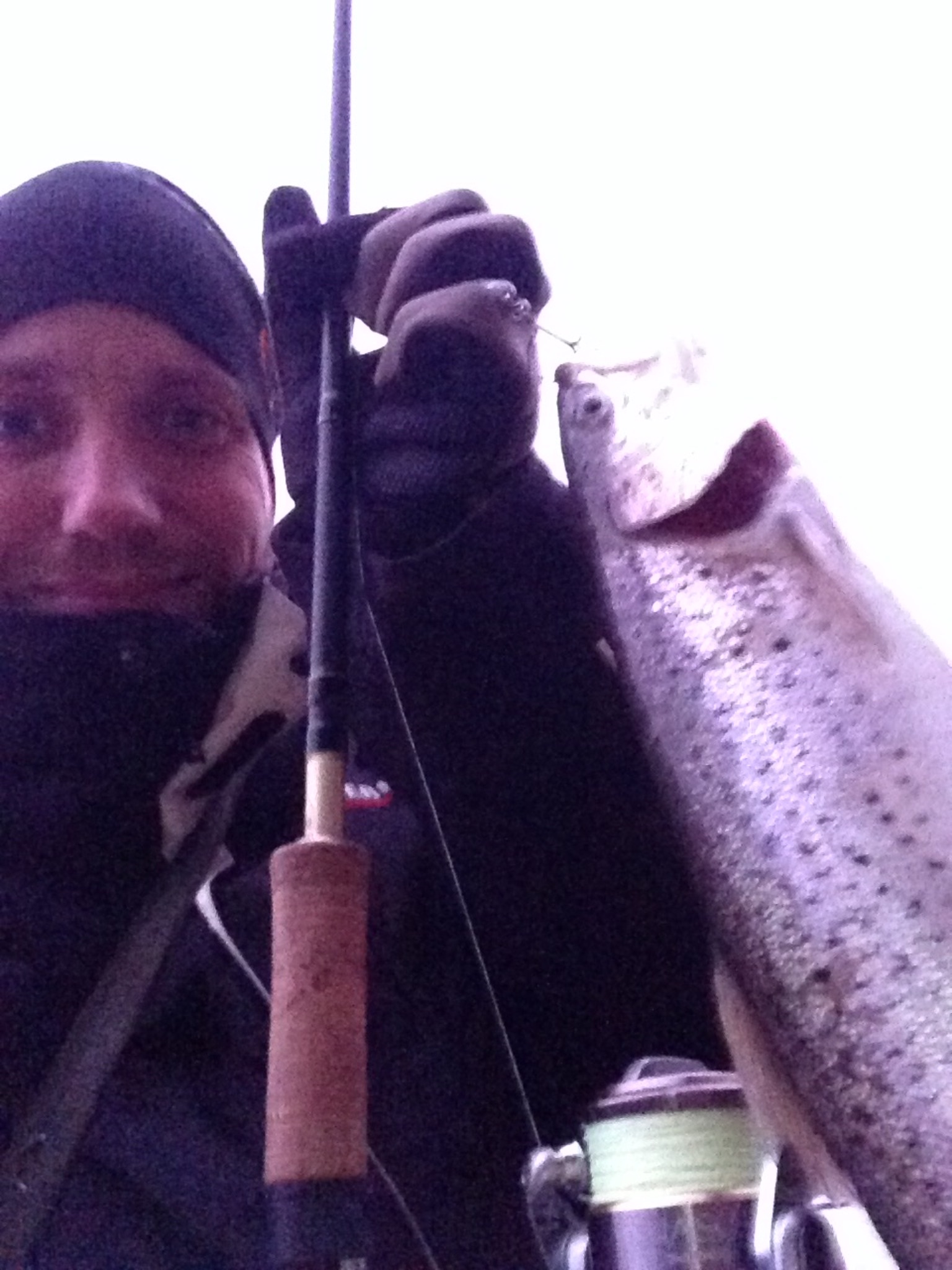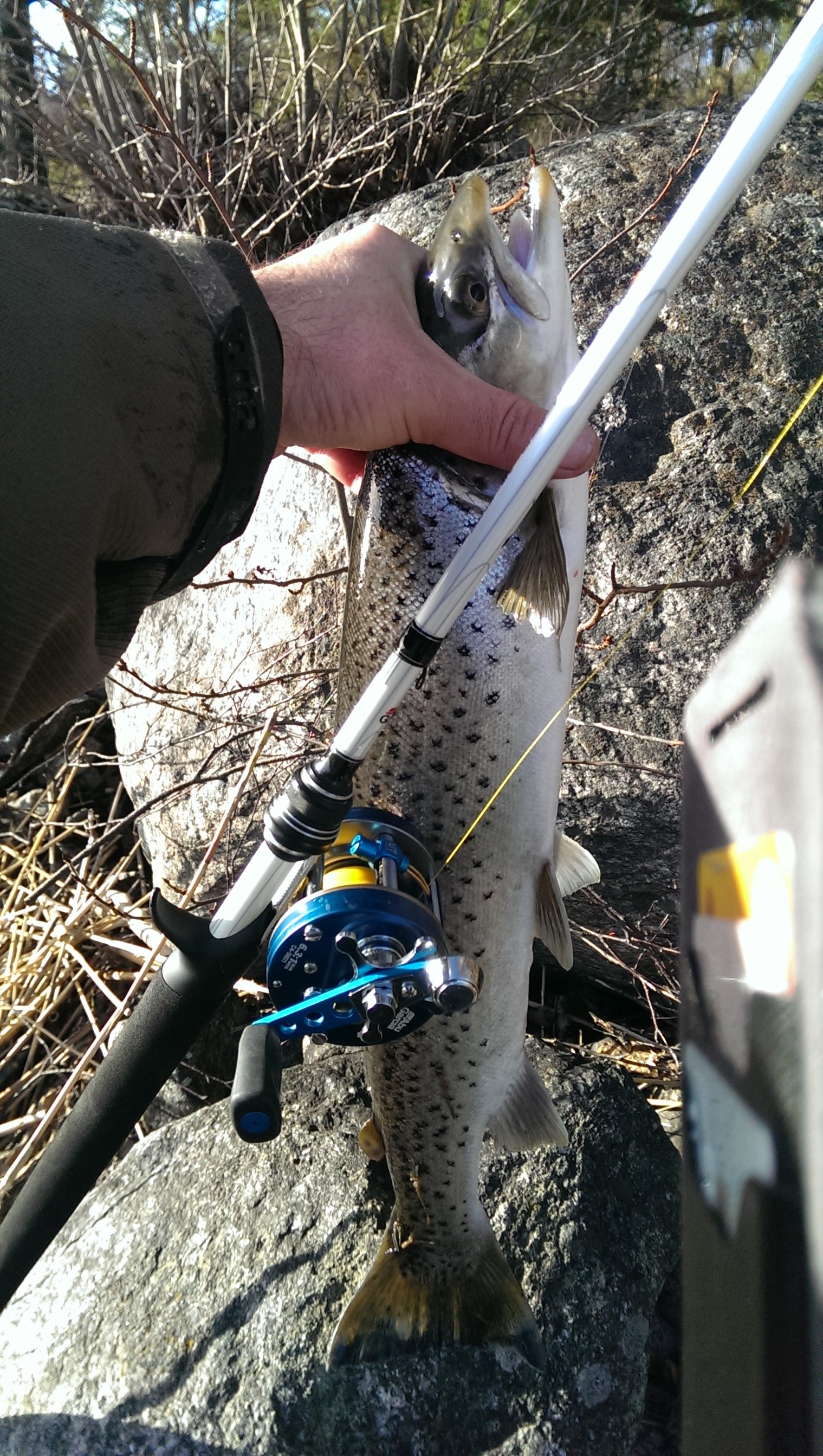På Mörkö, kl. 17:30, 7 grader i luften och säkert kallare i vattnet. Ca 5-7 m/s sydväst. Bete Silverbågens favorit. Blank på ca 45-50 cm. Ej fettfena.